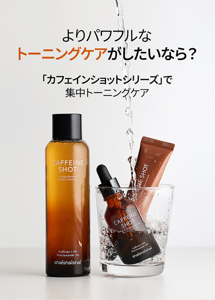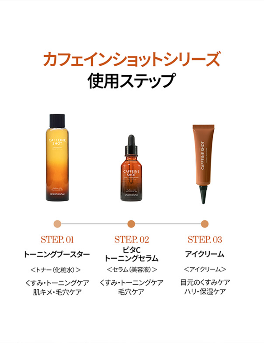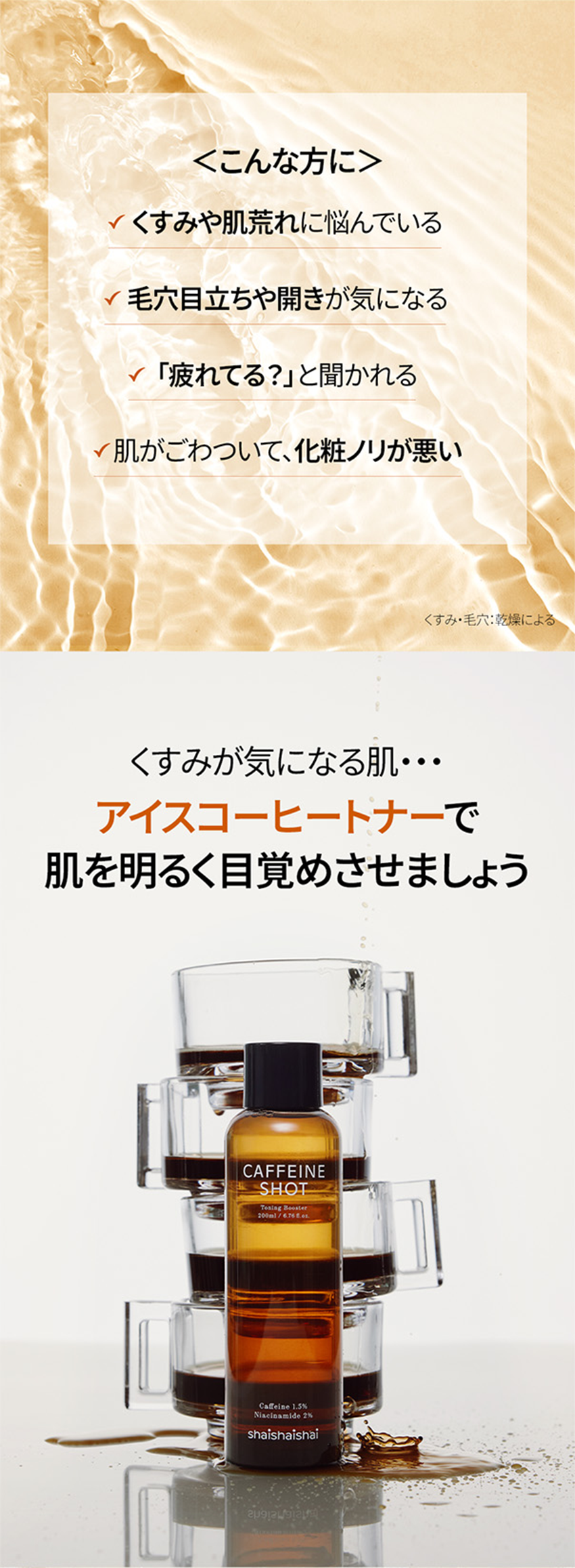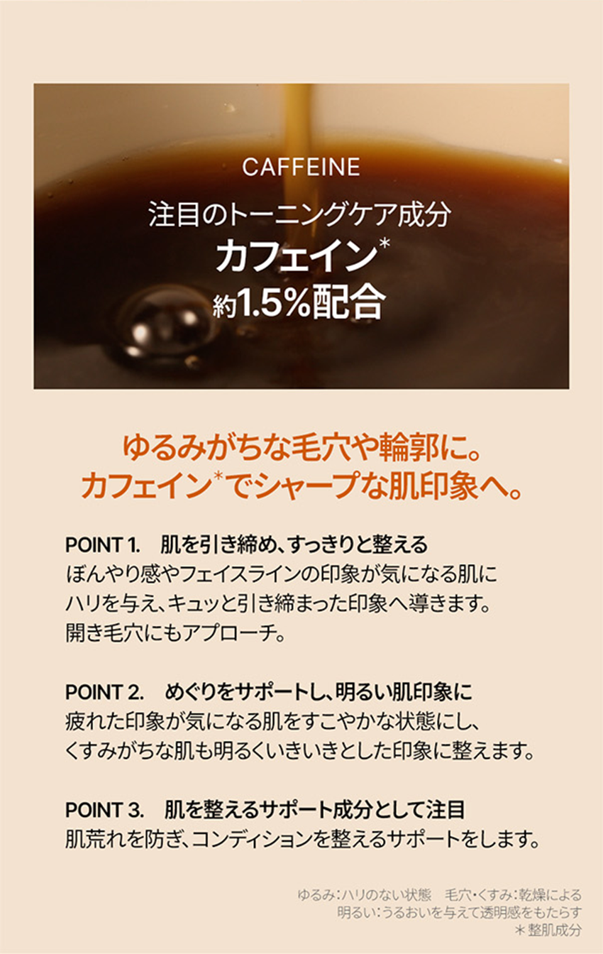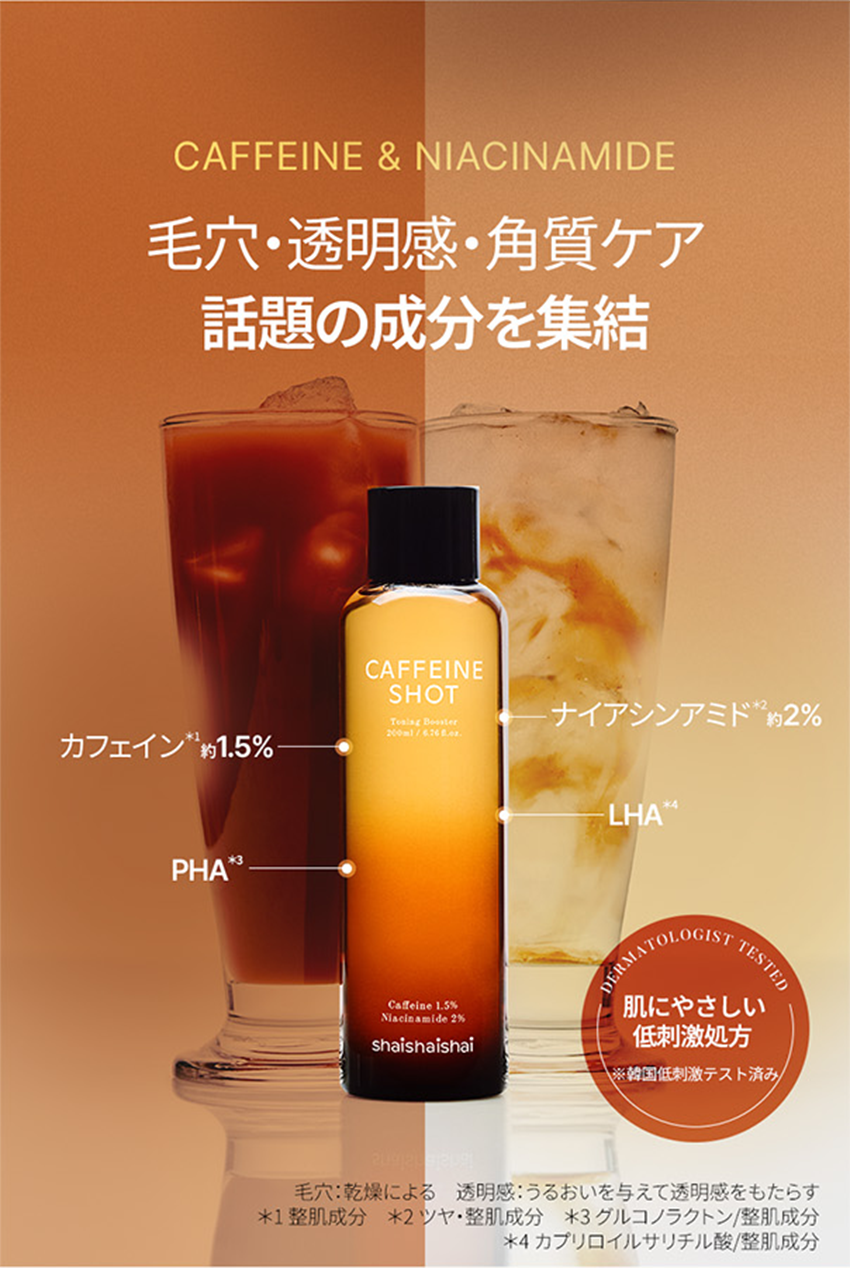 水、グリセリン、ナイアシンアミド、カフェイン、ラクトビオン酸、ツボクサエキス、BG、アンザンジュエキス、ヒノキ葉エキス、デキストリン、1,2-ヘキサンジオール、グルコノラクトン、(C12-14)パレス-12、エチルヘキシルグリセリン、グリセリルグルコシド、カプリロイルサリチル酸、キサンタンガム、EDTA-2Na、カラメル、香料、クエン酸