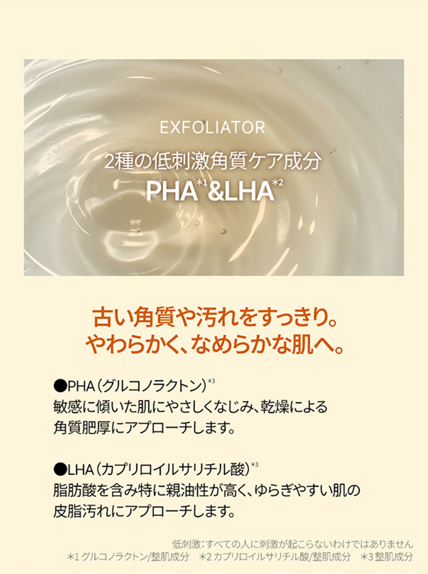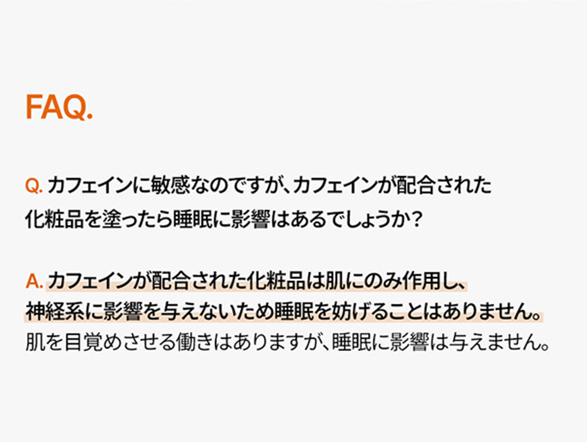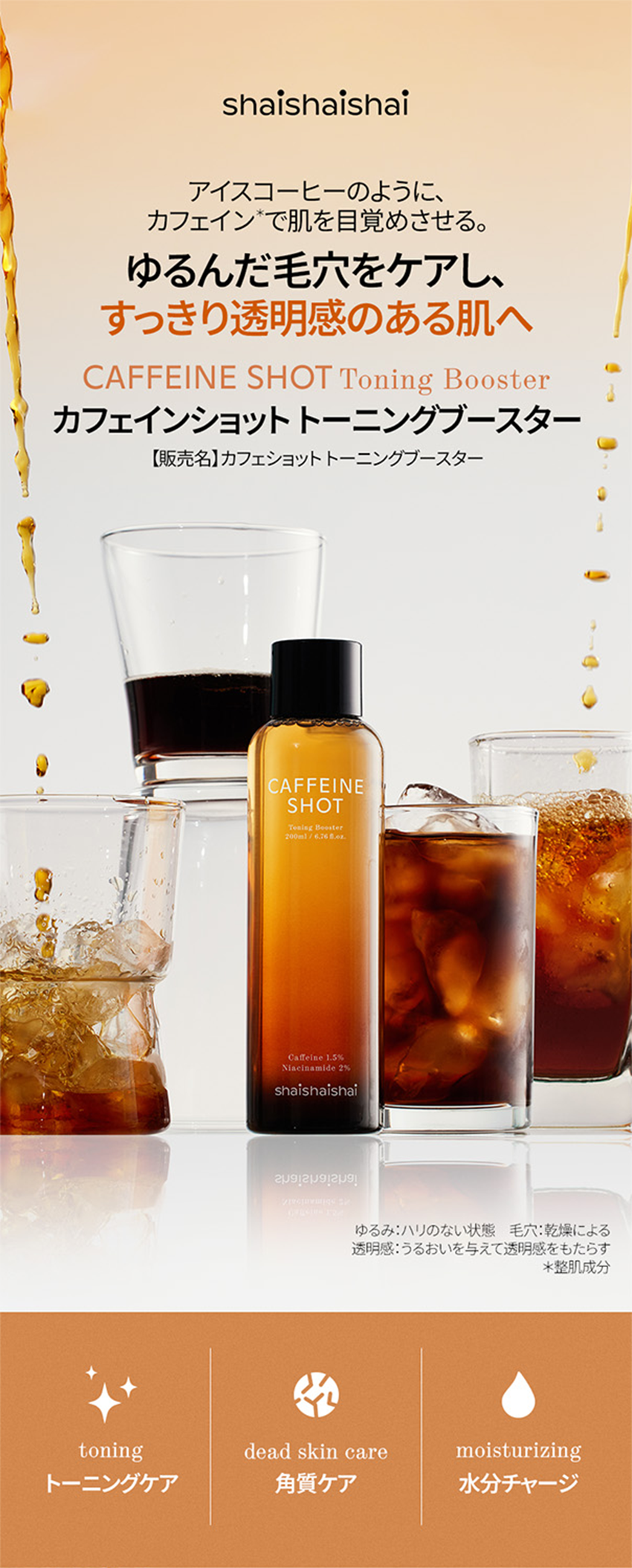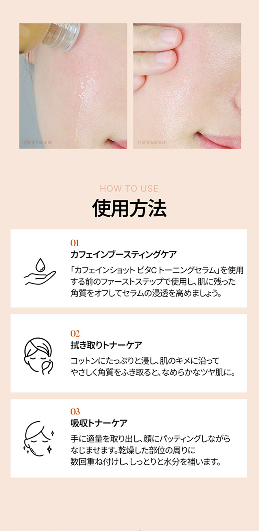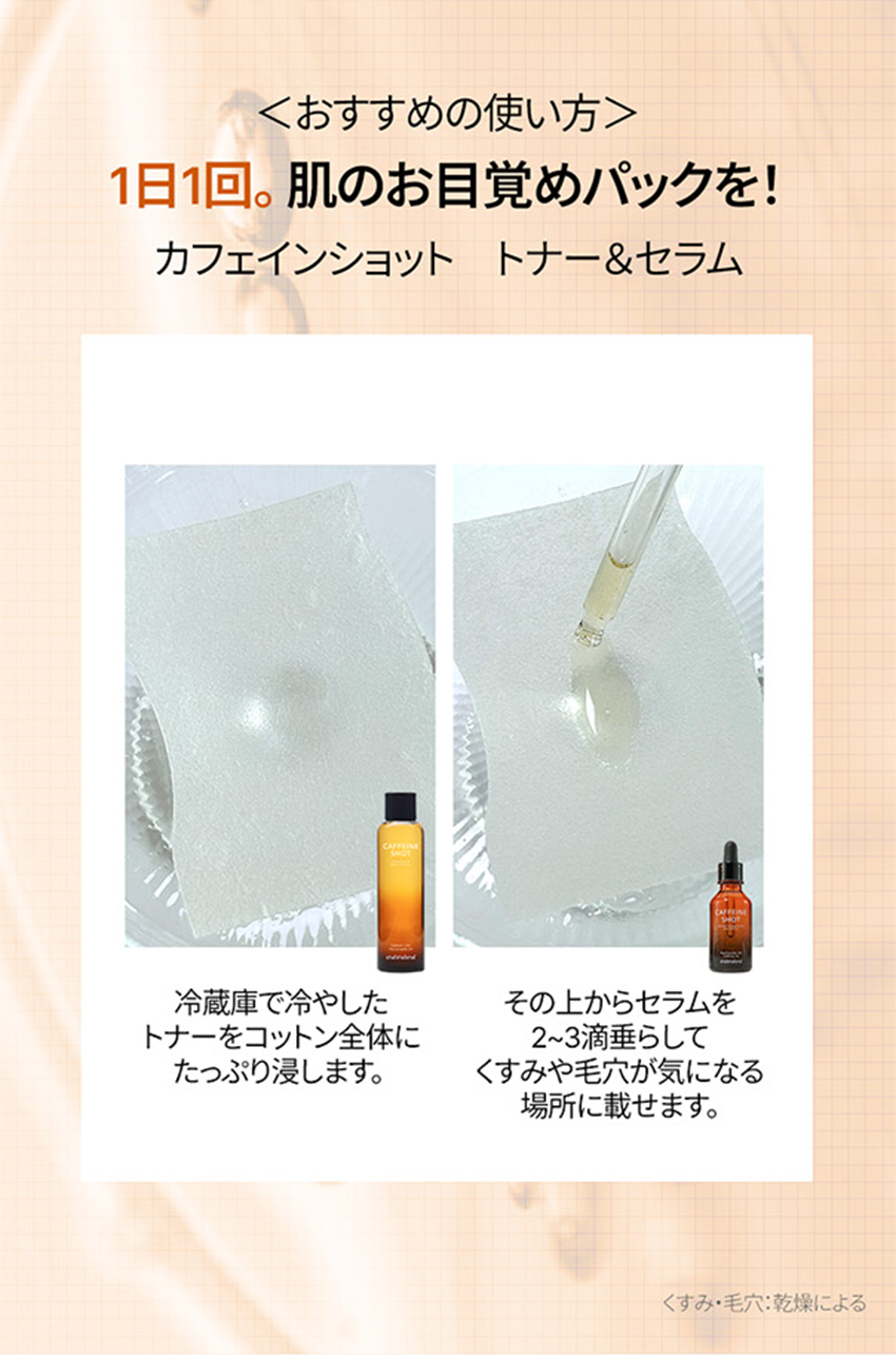水、グリセリン、ナイアシンアミド、カフェイン、ラクトビオン酸、ツボクサエキス、BG、アンザンジュエキス、ヒノキ葉エキス、デキストリン、1,2-ヘキサンジオール、グルコノラクトン、(C12-14)パレス-12、エチルヘキシルグリセリン、グリセリルグルコシド、カプリロイルサリチル酸、キサンタンガム、EDTA-2Na、カラメル、香料、クエン酸