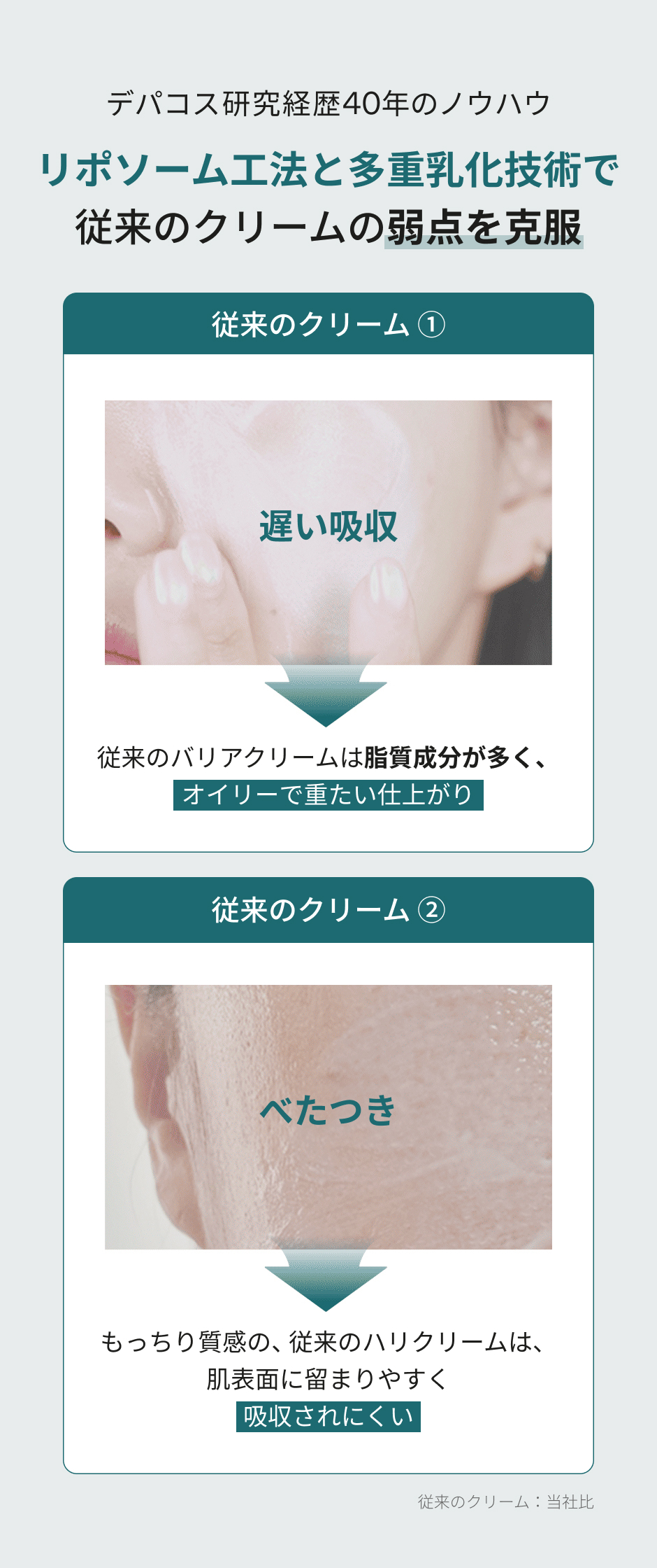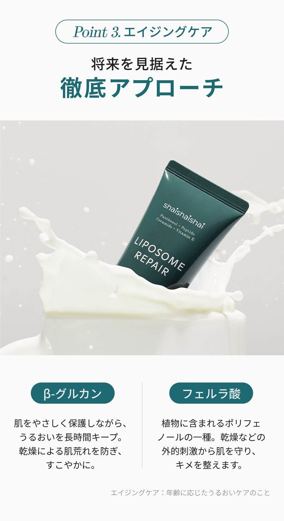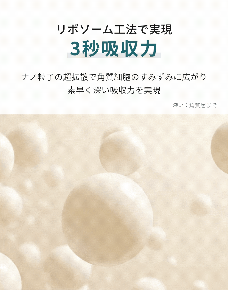 水、シクロペンタシロキサン、ジ(カプリル酸/カプリン酸)PG、トリ(カプリル酸/カプリン酸)グリセリル、グリセリン、リンゴ酸ジアルキル(C12,13)、リンゴ酸ジイソステアリル、DPG、BG、ジメチコン、尿素、ポリリシノレイン酸ポリグリセリル-6、PEG-10ジメチコン、シクロヘキサシロキサン、ジステアルジモニウムヘクトライト、炭酸プロピレン、水添レシチン、シア脂、レシチン、アデノシン、EDTA-2Na、パンテノール、グリセリルグルコシド、1,2-ヘキサンジオール、アンザンジュエキス、フェルラ酸、リョクトウ種子エキス、β-グルカン、トコフェロール、シラカンバ樹皮エキス、グレープフルーツ果実エキス、グルコース、セラミドNP、アセチルヘキサペプチド-8、トリペプチド-1銅、エチルヘキシルグリセリン、ナガバギシギシ根エキス、香料