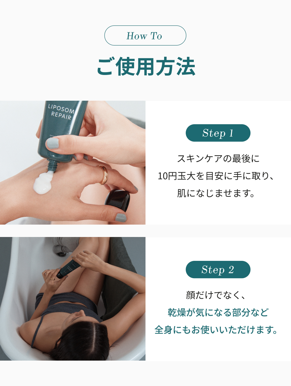 スキンケアの最後に10円玉大を目安に手に取り、肌になじませます。顔だけでなく、乾燥が気になる部分など全身にもお使いいただけます。