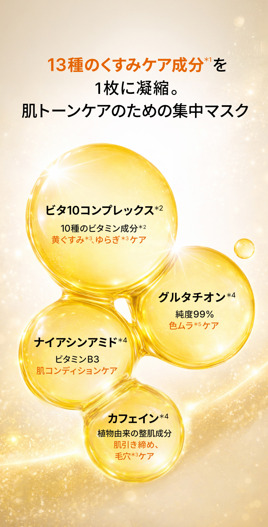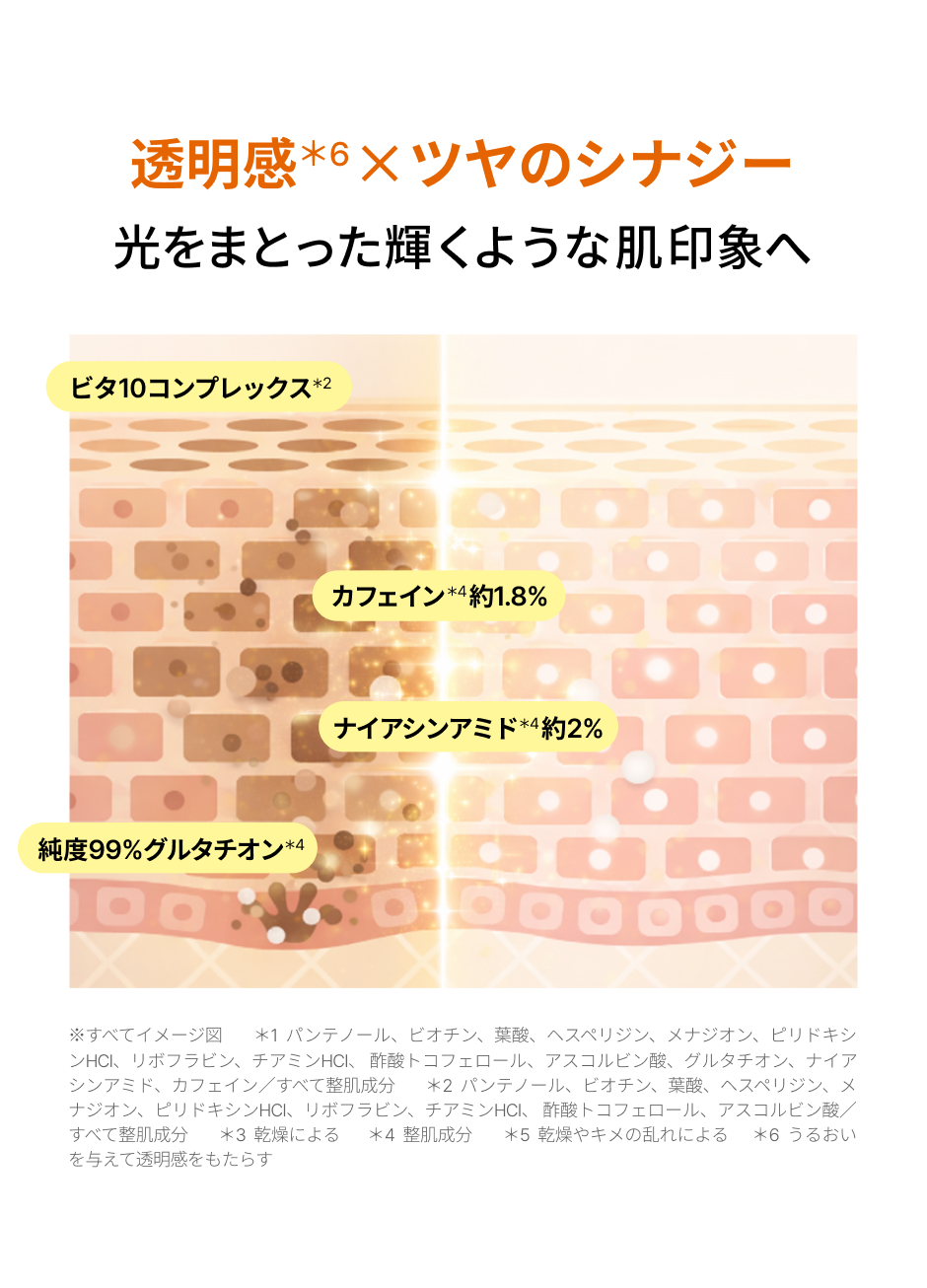 水、BG、メチルプロパンジオール、グリセリン、ナイアシンアミド、カフェイン、1,2-ヘキサンジオール、ヒドロキシアセトフェノン、トレハロース、アルギニン、カルボマー、パンテノール、ラウリン酸ポリグリセリル-10、プロパンジオール、エチルヘキシルグリセリン、アミノ酪酸、アデノシン、キサンタンガム、エチレンジアミンジコハク酸3Na、香料、ヒアルロン酸Na、ビオチン、カルニチンHCl、葉酸、ヘスペリジン、メナジオン、ピリドキシンHCl、リボフラビン、チアミンHCl、酢酸トコフェロール、グルタチオン、アスコルビン酸