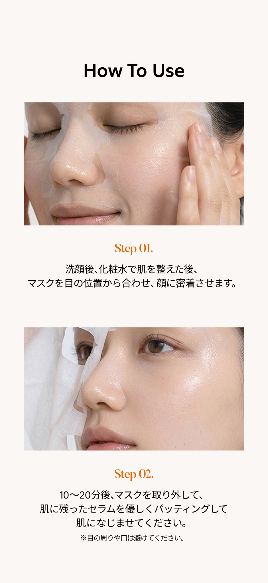 洗顔後、化粧水で肌を整えた後、マスクを目の位置から合わせ、ヨレなどを調整し、顔に密着させます。